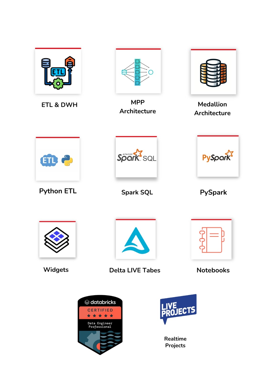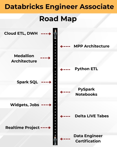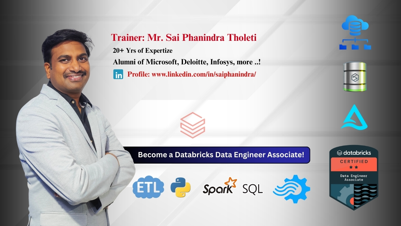 This training covers Databricks concepts end-to-end including Spark SQL, PySpark, Delta Lake, Lakehouse, Auto Loader, DLT, Unity Catalog, Workflows, Streaming, Medallion Architecture, and Real-Time Projects.